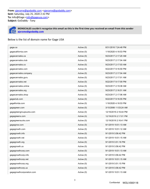 The discovery record produced by Canopy Growth, Terrascend, and Cookies affiliated franchise doing business as “gage growth” or “gage cannabis co” includes documentary evidence obtained from GoDaddy identifying ownership and control of a large number of internet domain names incorporating the terms “gage,” “gage green,” “gage green sucks,” “gage growth,” “gage cannabis,” and related variations.